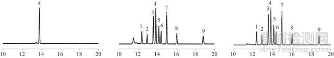 在1.2儀器工作條件下,對陰性樣品分別進行低、中、高濃度水平的加標回收試驗,測定結(jié)果見表3。由表3可知,樣品平均加標回收率為96.2%~102.2%,說明該方法測試結(jié)果準確、可靠??瞻讟悠?、加標樣品、混合標準溶液色譜圖見圖2。