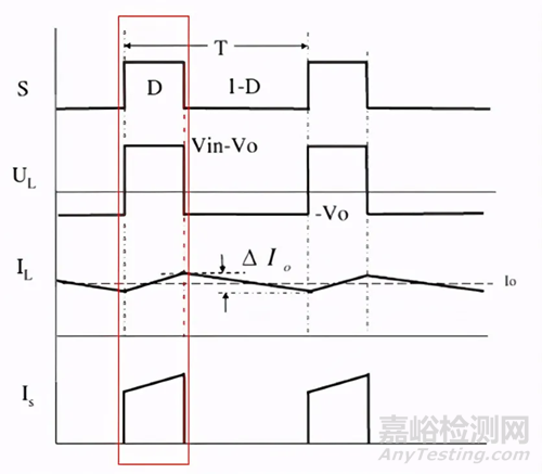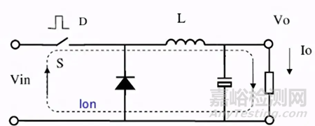 當(dāng)開(kāi)關(guān)導(dǎo)通時(shí):輸入電壓Vin加到LC濾波器的輸入端,電感上的電流以固定斜率線性上升。如下圖