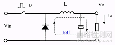當(dāng)開(kāi)關(guān)關(guān)斷時(shí):由于電感上的電流不能突變,電感中存儲(chǔ)的能量向負(fù)載釋放,電感電流通過(guò)二極管續(xù)流 ,在這個(gè)階段,電流波形是一條斜率為負(fù)的斜線。如下圖