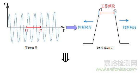 射頻信號f1-f2,通過濾波器,經(jīng)過濾波器響應(yīng),通帶內(nèi)的插損較小,信號略微較小,帶外信號經(jīng)濾波器響應(yīng),被完全抑制掉。