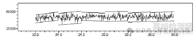 將色譜信號按照固定寬度分成若干區(qū)間(圖中的時間寬度為 0.5min),然后在每個區(qū)間內(nèi) 利用最小二乘法擬合出一條直線,之后平行移動此直線囊括所有數(shù)據(jù)點,得到兩條包絡線。所 有區(qū)間的包絡線幅值再取平均值,即為噪聲。將選定區(qū)間內(nèi)(一般取 30min 左右)所有數(shù)據(jù)點進行最小二乘擬合,獲得曲線的斜率值即 為漂移。色譜峰高值為信號值,信號與噪聲的比例即為信噪比。信噪比是確定方法檢出限和定量限 的重要依據(jù)。