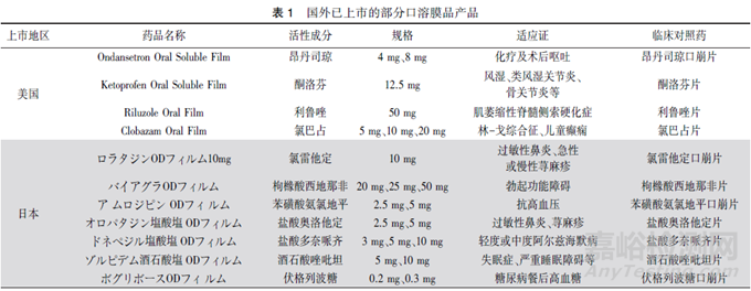 2006年,日本 上市了第一個(gè)口溶膜處方藥伏格列波糖口溶膜。2010年,美國和歐洲 分別上市第一個(gè)口溶膜處方藥昂丹司瓊口溶膜(Rapidfilm和Setofilm)。2020年,國家藥品監(jiān)督管理局 批準(zhǔn)了第一個(gè)口溶膜化學(xué)藥品奧氮平口溶膜上市。目前,全球已有多個(gè)口溶膜產(chǎn)品上市,查詢美國[6]、歐洲[7]、日本[8]藥品監(jiān)管機(jī)構(gòu)網(wǎng)站,部分品種信息見表1。