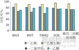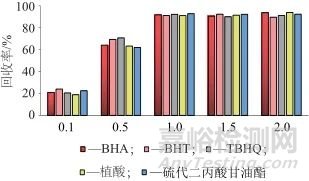 圖1 使用不同提取溶劑時(shí)5種抗氧化劑的回收率(n=3)