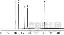 4—植酸;5—硫代二丙酸甘油酯圖3 5種抗氧化劑混合標(biāo)準(zhǔn)溶液氣相色譜圖