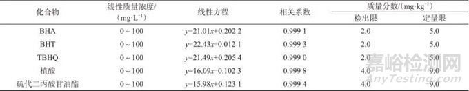 表1 5種抗氧化劑線性關(guān)系、檢出限及定量限