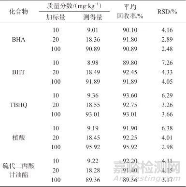 取一定量的5種抗氧化劑系列混合標(biāo)準(zhǔn)工作溶液于進(jìn)樣小瓶中,采用所建方法進(jìn)行分析,分別以5種抗氧化劑標(biāo)準(zhǔn)溶液的質(zhì)量濃度(x)為橫坐標(biāo),對(duì)應(yīng)色譜峰面積(y)為縱坐標(biāo),繪制標(biāo)準(zhǔn)工作曲線。以3倍信噪比對(duì)應(yīng)的標(biāo)準(zhǔn)溶液的濃度折算成樣品中的質(zhì)量分?jǐn)?shù)作為方法檢出限,以10倍信噪比對(duì)應(yīng)的標(biāo)準(zhǔn)溶液的濃度折算成樣品中的質(zhì)量分?jǐn)?shù)作為定量限。5種抗氧化劑質(zhì)量濃度線性范圍、線性方程、相關(guān)系數(shù)、檢出限及定量限見表1。由表1可知,5種抗氧化劑的質(zhì)量濃度在0~100 mg/L范圍內(nèi)與色譜峰面積具有良好的線性關(guān)系,相關(guān)系數(shù)均大于0.999。檢出限為2.0~4.0 mg/kg,定量限為5.0~9.0 mg/kg。