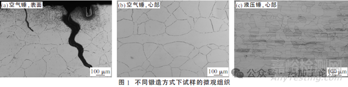圖1為合金經(jīng)空氣錘和液壓錘鍛造后的微觀組織。從圖1(a)、(b)可看出,合金用空氣錘鍛造時(shí),棒材表面易出現(xiàn)晶間沿晶斷裂裂紋,變形不易深入,晶粒較粗大、不均勻;從圖1(c)可看出,相比于空氣錘鍛造,經(jīng)液壓錘鍛造的棒材極易成形,其晶粒組織比較等軸、均勻。這是因?yàn)榭諝忮N是以沖擊力使坯料變形,打擊速度快,合金的內(nèi)部應(yīng)力得不到釋放,容易導(dǎo)致應(yīng)力集中而開裂;液壓錘是以靜壓力代替了鍛錘的沖擊力,緩慢壓下過程中避免了對(duì)合金的振動(dòng),合金的應(yīng)力容易得到釋放, 同時(shí)使合金中殘存的氣孔、縮松等微觀缺陷被鍛合在一起, 改善了合金的組織,使變形容易深入,合金組織更趨于均勻、細(xì)小、等軸。
