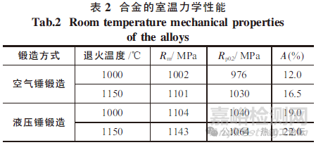 對(duì)空氣錘和液壓錘鍛造的棒材試樣分別在1000和1150℃下進(jìn)行消應(yīng)力和再結(jié)晶退火,然后測試其室溫力學(xué)性能。不同條件下合金的力學(xué)性能見表2。通過表2可發(fā)現(xiàn):在空氣錘鍛造后并消應(yīng)力退火,合金的抗拉強(qiáng)度為1002MPa,經(jīng)過再結(jié)晶退火后合金的抗拉強(qiáng)度達(dá)到了1101MPa,抗拉強(qiáng)度提高了99MPa,斷后伸長率由12.0%提高到16.5%;液壓錘鍛造后在消應(yīng)力狀態(tài)下合金的性能比較優(yōu)良,抗拉強(qiáng)度在1104MPa,斷后伸長率達(dá)到了19.0%,超過了在空氣錘鍛造下合金在再結(jié)晶狀態(tài)的斷后伸長率,而再結(jié)晶退火后合金的性能提高不是很明顯。這是由于空氣錘鍛造,合金不易變形,晶粒比較粗大,不利于塑性的提高;用液壓錘鍛造時(shí)充分破除了原始的粗大組織,且使棒材內(nèi)部的氣孔、疏松等缺陷進(jìn)一步致密,合金中的各種偏析得到了很好改善,使得成分等進(jìn)一步均勻化, 使合金的性能得到了更大的改善。