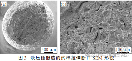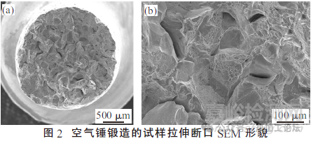 為了進(jìn)一步研究合金的變形機(jī)理,研究了合金的斷裂行為,對(duì)合金的室溫拉伸斷口進(jìn)行了分析,分別見圖2、3所示。通過觀察圖2發(fā)現(xiàn),經(jīng)空氣錘鍛造的拉伸試樣的斷口宏觀形貌上剪切唇較少, 微觀形貌上有韌窩存在,但較小、較淺,另外有明顯的像花瓣?duì)畹乃毫牙夂洼^短的、不連續(xù)的河流花樣存在,合金的斷裂形式表現(xiàn)為韌窩斷裂機(jī)制的同時(shí)伴有準(zhǔn)解理斷裂機(jī)制,因此合金的塑性較差。觀察圖3發(fā)現(xiàn),經(jīng)液壓錘鍛造的拉伸試樣的斷口宏觀形貌上具有明顯的剪切唇標(biāo)記,微觀形貌上有大量的韌窩存在,較深且較等軸,另外伴有個(gè)別撕裂棱存在,合金的斷裂形式主要表現(xiàn)為韌窩斷裂機(jī)制,合金的塑性較好。