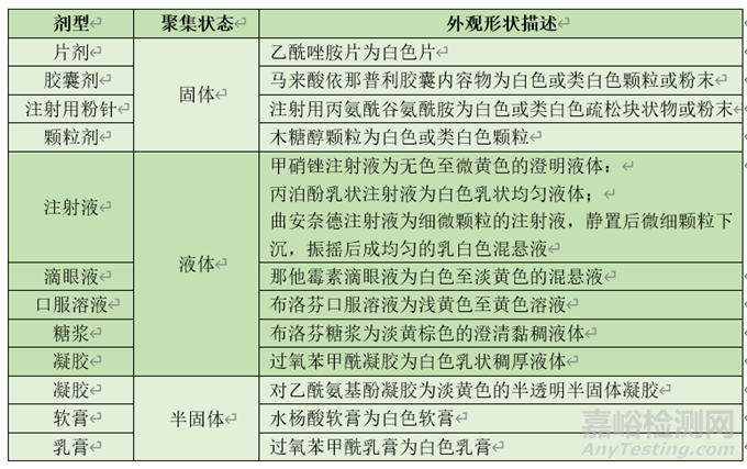 外觀指藥品的色澤和外表感官,具體包括顏色、外觀形狀(或聚集狀態(tài))、臭、味、引濕性/風(fēng)化或遇光變質(zhì)等性質(zhì)。