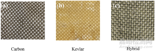圖1.三種纖維層合復合材料:(a) 碳纖維層合復合材料,(b) 凱夫拉纖維層合復合材料,(c) 混合纖維層合復合材料。