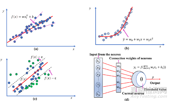 圖2.四種不同的機器學習算法的示意圖:(a) 線性回歸,(b) 多項式回歸,(c) 支持向量機 (SVM),(d) 多層感知器 (人工神經(jīng)網(wǎng)絡)。
