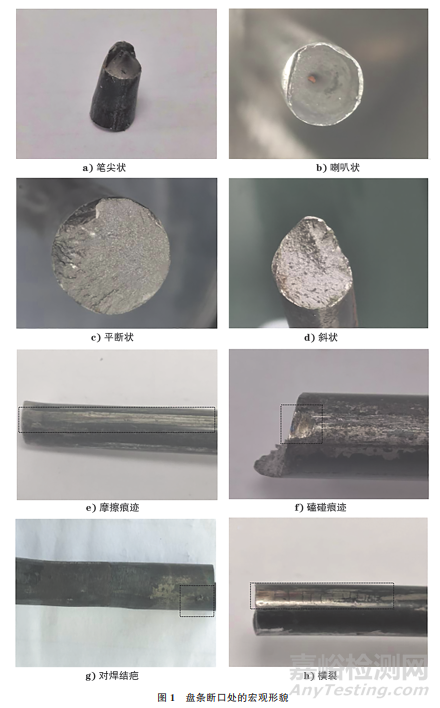 圖1為盤條斷口處的宏觀形貌。由圖1可知:筆尖狀和喇叭狀斷口的裂紋源位于試樣中心,在斷口上未發(fā)現(xiàn)微裂紋等其他缺陷;平斷狀和斜狀斷口的裂紋源位于試樣邊部,且試樣邊部所在表面存在明顯摩擦、磕碰和對(duì)焊結(jié)疤等損傷痕跡,甚至存在橫裂現(xiàn)象。