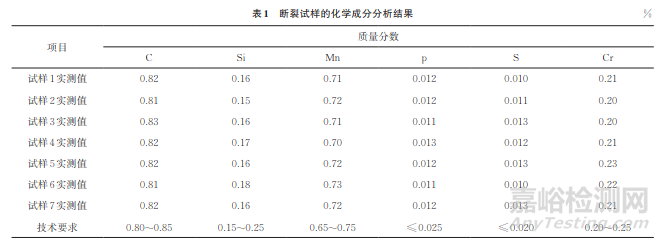 在盤條斷口附近截取試樣,其中試樣1~2的取樣位置為筆尖狀、喇叭狀斷口處,試樣3~7的取樣位置為平斷狀、斜狀斷口處,對(duì)試樣1~7進(jìn)行化學(xué)成分分析,結(jié)果如表1所示。由表1可知:試樣的化學(xué)成分滿足技術(shù)要求。