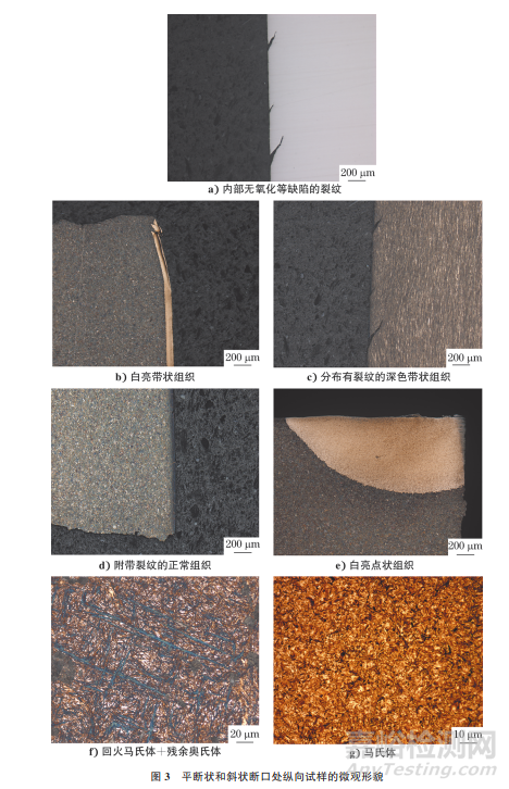 在平斷狀和斜狀斷口邊部裂紋源處截取縱向試樣,對(duì)試樣進(jìn)行金相檢驗(yàn),結(jié)果如圖3所示。由圖3可知:試樣大部分無(wú)明顯缺陷,少部分存在與邊部成45°且內(nèi)部無(wú)氧化等缺陷的裂紋;腐蝕后試樣基體組織均正常,為索氏體+珠光體+鐵素體+滲碳體,在裂紋源所在邊部存在白亮色帶狀組織、分布有裂紋的深色帶狀組織、附帶裂紋的正常組織、白亮點(diǎn)狀組織和回火馬氏體+ 殘余奧氏體等,其中白亮色帶狀組織為馬氏體。