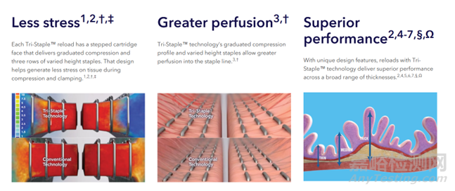 Tri-Staple技術(shù)通過三排不等高和漸進性夾閉的獨特設計,實現(xiàn)了吻合嚴密、適配組織厚度和預防損傷的效果,大大提升了患者的術(shù)中安全和術(shù)后愈合。