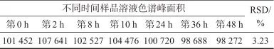 選擇2.7中10-HDA加標(biāo)量為21.68 μg的加標(biāo)樣品溶液,分別于第0、2、6、10、24、36、48 h時(shí)進(jìn)行液相色譜分析,結(jié)果見表2。由表2可知,色譜峰面積測定結(jié)果的相對標(biāo)準(zhǔn)偏差為3.23%,表明加標(biāo)樣品溶液在48 h內(nèi)穩(wěn)定性良好。