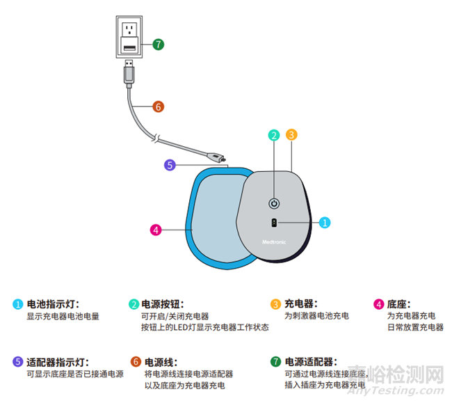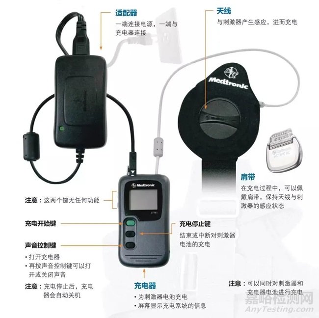 美敦力Activa RC腦起搏器的主要充電系統(tǒng)組件包括充電器、適配器、肩帶和天線。各充電系統(tǒng)組件的具體樣式和說明如下圖: