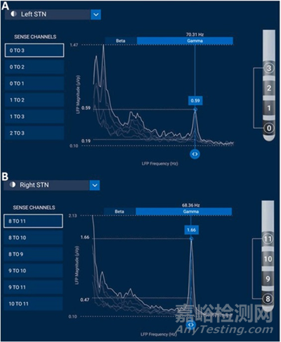 β頻段在 13-30 Hz 范圍內(nèi),通常被認(rèn)為與肌肉僵硬的存在相關(guān),較大的 LFP 幅度反映了嚴(yán)重程度的增加。當(dāng)刺激的增加導(dǎo)致肌肉僵硬和運(yùn)動(dòng)遲緩改善時(shí),隨后應(yīng)進(jìn)行 β LFP 峰值衰減。頻率為 31-200 Hz 的伽馬振蕩帶被認(rèn)為與運(yùn)動(dòng)障礙相關(guān),峰值越高代表運(yùn)動(dòng)障礙越嚴(yán)重。通過監(jiān)測 β 和 γ 頻率振蕩的存在和幅度,治療團(tuán)隊(duì)獲得了額外的信息,使他們能夠記錄客觀數(shù)據(jù)并優(yōu)化患者的治療計(jì)劃。