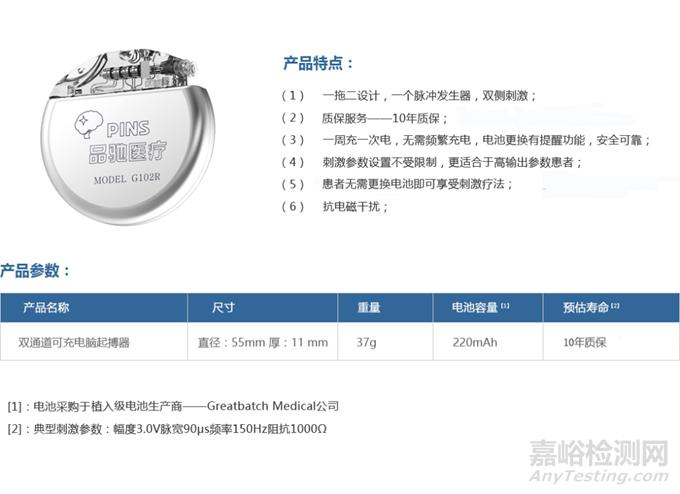 雙通道可充電腦起搏器;直徑:52mm,厚:11mm;重量:37g;電池容量:220mAh;預(yù)估壽命:20年質(zhì)保