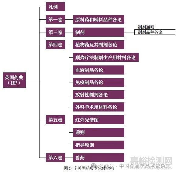 各國及地區(qū)的藥典標準體系總體架構類似。目前,只有《中國藥典》和BP 仍分卷冊收載藥品標準?!吨袊幍洹吠怀龈髡摌藴?,各論標準約占一級結構的87.5%。USP/NF 將啟動文章、試劑和參考表格、其他資源均作為一級結構,體現了USP/NF 內容的多元化。EP 將包裝容器和材料通則、試劑、產品總論、制劑通則均作為一級結構,強調了對不同類型產品的控制要求。JP 將植物藥通則、紅外光譜圖和紫外光譜圖作為一級結構,體現了對于植物藥標準和配套標準的重視。BP 的一級結構以各論標準為主,與其他藥典不同的是,BP 將藥用物質(即原料藥和輔料)與制劑單獨收載,將紅外光譜圖也作為一級結構。IP 將凡例的輔助說明、紅外光譜圖、試劑試藥等作為一級結構,更好地幫助使用者執(zhí)行相關要求(圖1~6)。