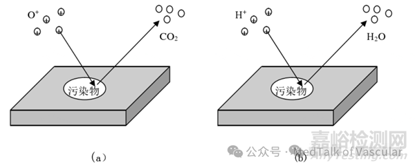 氣體放電產(chǎn)生的等離子體中有電子、正離子、亞穩(wěn)態(tài)的分子和原子等,當(dāng)被清洗件浸沒到等離子中時,等離子體中的化學(xué)活性粒子就與材料表面的污染物發(fā)生化學(xué)反應(yīng),如果是氫離子,反應(yīng)為還原反應(yīng);如果是氧離子,則發(fā)生氧化反應(yīng)。圖二分別是氧等離子體和氫等離子體清洗時反應(yīng)的原理圖,其中(a)表示氧等離子體反應(yīng)的過程,可以看出,氧等離子體中的活性粒子與有機(jī)污染物發(fā)生化學(xué)反應(yīng),有機(jī)污染物被分解,生成了二氧化碳;(b)則表示氫等離子反應(yīng)的過程,氫等離子中的活性粒子與氧化物發(fā)生還原反應(yīng),氧化物被還原成水。