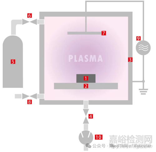 1-產(chǎn)品 2-載物托盤 3-真空室 4-角閥 5-氣瓶 6-壓力控制系統(tǒng) 7-電極 8- 電極 9-等離子發(fā)生器 10-真空泵