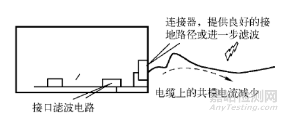 我們可以通過設計電纜端口的接口電路或在電纜的端口處使用低通濾波器或其它抑制電路, 濾除電纜上的高頻共模電流, 如下圖所示: