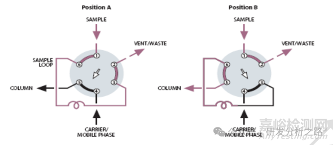 閥工作在兩個狀態(tài)之下——取樣和進(jìn)樣。取樣狀態(tài)時閥位置如左圖所示,樣品此時經(jīng)由閥 端口 1、6、3、2 進(jìn)入定量環(huán),多余部分排空。進(jìn)樣狀態(tài)時閥位置如右圖所示,進(jìn)樣閥旋轉(zhuǎn) 60 度,載氣經(jīng)由閥端口 4、3、6、5,將定量環(huán)中樣品推入色譜柱。另外,內(nèi)置有小體積定量環(huán)的進(jìn)樣閥也可以進(jìn)樣液體樣品,常見于化工分析中。