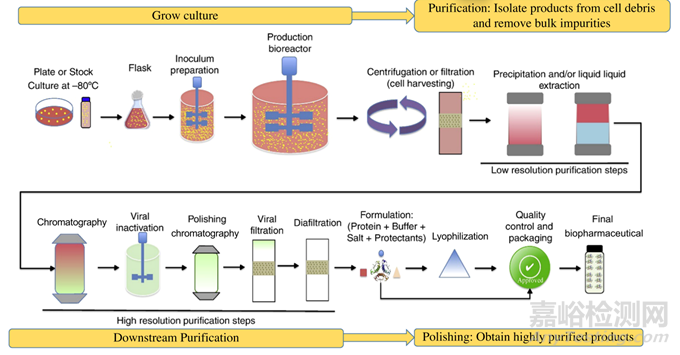 圖 3. 生物制藥生產(chǎn),分離和純化步驟的簡要流程圖,主要分為上游發(fā)酵 (細(xì)胞培養(yǎng)) 和下游純化兩個(gè)部分