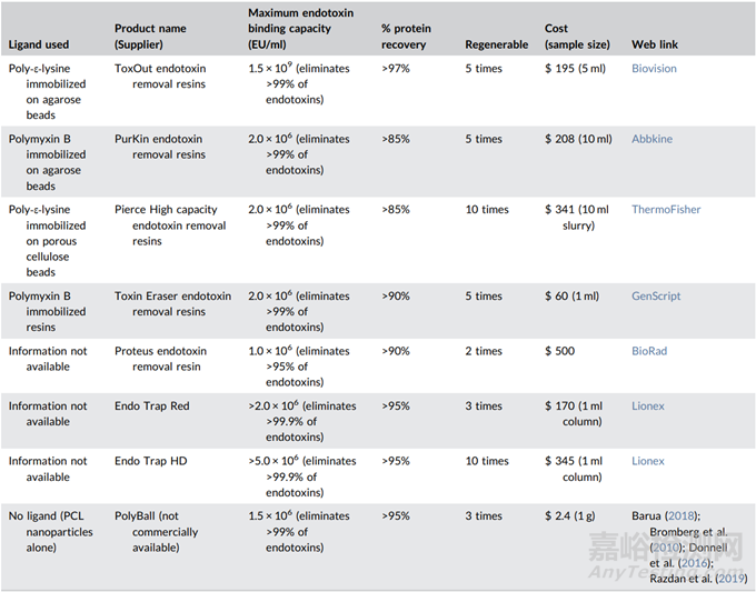 商品化填料 (表2):成本效益高的配體及其結(jié)合能力是純化過程中去除內(nèi)毒素的關(guān)鍵因素。聚-ε-賴氨酸和PMB是常用的兩種配體。表2匯總了這些配體相關(guān)商品化產(chǎn)品的內(nèi)毒素結(jié)合能力、蛋白質(zhì)回收率、可再生性和成本。