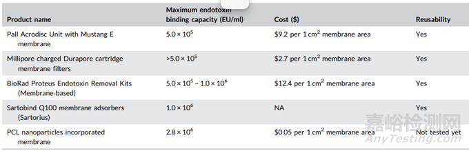 表 3. 膜吸附用于內(nèi)毒素去除的比較