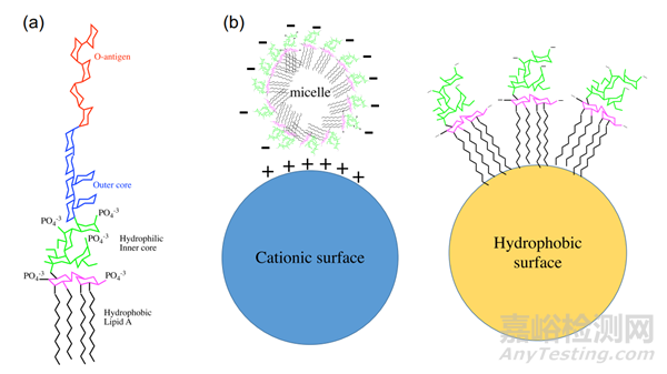 圖 1. (a) 來自大腸桿菌內(nèi)毒素的化學(xué)結(jié)構(gòu)示意圖,內(nèi)毒素是由長鏈多糖 (O-抗原),核心多糖和非極性脂質(zhì)A尾部構(gòu)成的脂多糖結(jié)構(gòu) (b) 內(nèi)毒素以膠束,立方體,層狀或囊泡形式聚集,在藥物溶液中呈現(xiàn)凈負(fù)電荷。帶負(fù)電荷的“膠束”內(nèi)毒素可以吸附在多聚陽離子配體上,或者可以通過疏水脂質(zhì)尾部與疏水表面的相互作用去除單個(gè)內(nèi)毒素單體
