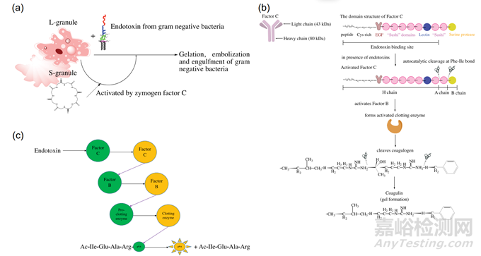 圖 2. (a) 內(nèi)毒素誘導(dǎo)的鱟循環(huán)血淋巴防御機(jī)制。鱟變形細(xì)胞裂解物 (LAL) 檢測(cè)是根據(jù)鱟血液中產(chǎn)生的免疫原性反應(yīng)設(shè)計(jì)的。暴露于內(nèi)毒素后,電子致密的大顆粒 (L 顆粒) 和電子密度較低的小顆粒 (S 顆粒) 變形細(xì)胞會(huì)被酶原C因子激活; (b) 鱟血凝血級(jí)聯(lián)反應(yīng)。內(nèi)毒素激活質(zhì)膜結(jié)合C因子,C因子是一種單鏈糖蛋白 (分子量123 kDa),由重鏈 (分子量80 kDa) 和輕鏈 (分子量43 kDa) 組成,在免疫系統(tǒng)中起著關(guān)鍵激活劑的作用。因子與內(nèi)毒素結(jié)合后,自催化活性觸發(fā) Phe-Ile 鍵的裂解,從而產(chǎn)生活化的C因子,該因子與B因子相互作用,將其轉(zhuǎn)化為凝固酶。凝固酶在肽C的兩個(gè)末端 (Arg-Lys和Arg-Gly) 處裂解凝固蛋白原,形成不溶性凝固蛋白凝膠;(c) 鱟血中活性凝固酶的蛋白水解活性特征可用于合成顯色劑,即 Gly-Arg-p-硝基苯胺底物 (而不是凝固素原) 通過分離對(duì)硝基苯胺 (pNA) 來檢測(cè)內(nèi)毒素。添加顯色底物后,活性蛋白酶凝固酶 Ac-Ile-Glu-Ala-Arg-pNA 會(huì)催化 pNA 的釋放,產(chǎn)生黃色,可通過測(cè)量405 nm處的吸光度 (或 340 nm 處的吸光度) 與標(biāo)準(zhǔn)曲線關(guān)聯(lián)獲得內(nèi)毒素濃度