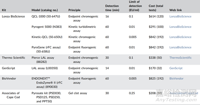表 1. 目前三種LAL檢測(cè)方法 (顯色法、凝膠法和濁度法) 的商品化試劑盒,以及基于rFC檢測(cè)法的商品化試劑盒