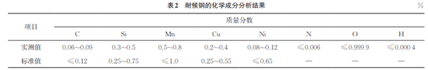 耐候鋼較普碳鋼具有良好的耐大氣腐蝕能力,其中合金元素起到了決定性作用,包括:降低銹層的導電性能,可以自身沉淀并覆蓋鋼表面;影響銹層中物相結構和種類,阻礙銹層的生長;延緩銹的結晶過程;加速鋼的均勻溶解過程;加速Fe2+向Fe3+ 的轉化,并能阻礙腐蝕產物的快速生長;合金元素及其化合物會阻塞裂紋和缺陷。在耐候鋼中加入不同合金元素對其耐大氣腐蝕性能的影響不完全相同。Cu元素具有優(yōu)越的耐腐蝕性能,Cu元素在鋼的表面及銹層中存在富集現(xiàn)象,可抵消鋼中S元素的有害作用。P元素是提高鋼耐大氣腐蝕性能最有效的合金元素之一,當P元素與Cu元素復合加入鋼中時,顯示出更好的復合效應。Cr元素能在鋼表面形成致密的氧化膜,提高鋼的鈍化能力,當Cr元素與Cu元素同時加入鋼中時,效果尤為明顯。Ni元素是一種比較穩(wěn)定的元素,加入Ni元素能使鋼的自腐蝕電位向正方向變化,增強鋼的穩(wěn)定性,耐候鋼的化學成分分析結果如表2所示。