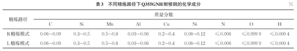 采用冷彎加工Q355GNH耐候鋼時,需要提高其品質,減少夾雜缺陷,某鋼廠從3爐R精煉模式轉2爐R精煉模式,造成R精煉爐生產緊張,為了生產及物流平衡,對耐候鋼開展R精煉爐轉L精煉爐處理,不同精煉路徑下Q355GNH耐候鋼的化學成分如表3所示。