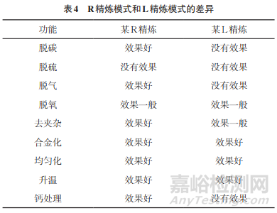 R精煉模式和L精煉模式的差異如表4所示。R精煉模式具備脫氣(脫氫)和脫碳的功能,R精煉模式處理鋼種能滿足連鑄長時間多爐連澆的需求,精煉周期短。L精煉模式不具備脫氣(脫氫)和脫碳的功能,主要具有成分、溫度控制和凈化鋼水的功能。