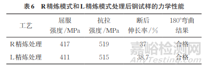 依據GB/T 4171—2008截取拉伸試樣,并對試樣進行力學性能測試,結果如表6所示。由表6可知:R精煉模式轉L精煉模式處理后的力學性能無明顯差異。