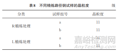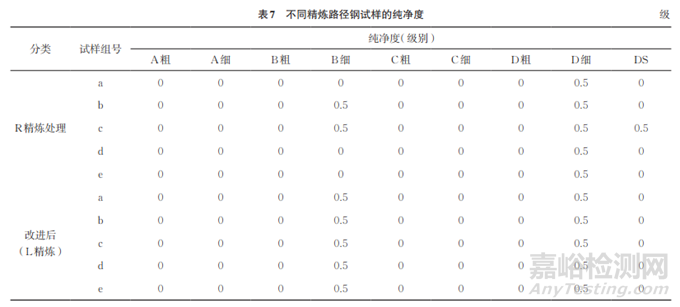 按GB/T 10561—2023的A法進行夾雜物檢測,結果如表7所示。由表7可知:R精煉和L精煉處理純凈度控制得均較好,從整體控制看,R精煉處理比L精煉處理的純凈度控制得更好。