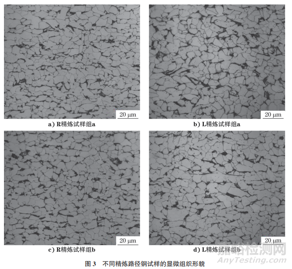 (4)R精煉和L精煉后Q355GNH鋼的顯微組織均以鐵素體和珠光體為主,晶粒度評級均為11級,無明顯差異。