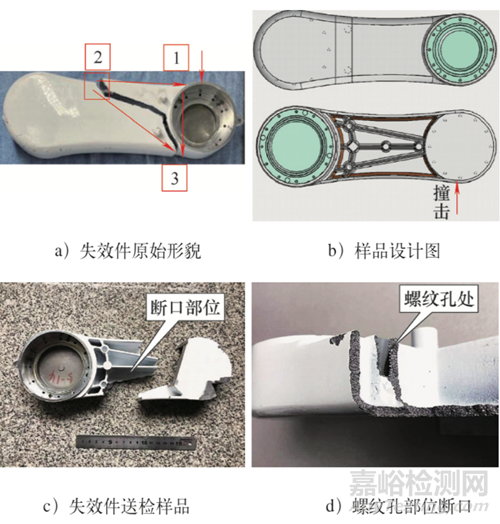 鋁合金大臂材料合金代號(hào)為ZL101A,該鋁合金 大臂采用熔模鑄造,未經(jīng)變質(zhì)處理,大臂表面經(jīng)過(guò) 噴砂處理及涂漆保護(hù)。機(jī)器人設(shè)備使用過(guò)程發(fā)生大臂斷裂,在大臂環(huán)形連接套外壁位置有明顯的撞擊痕跡(見(jiàn)圖1a紅色箭頭處)。為了直觀顯示撞擊部 位,客戶附上鋁合金大臂正面及背面設(shè)計(jì)圖(見(jiàn)圖 1b)。送檢鋁合金大臂斷裂樣品已殘缺,大臂斷裂 樣品的斷口大部分已缺失,其中左側(cè)的斷口被截取一半,右側(cè)的斷口已經(jīng)完全被截取(見(jiàn)圖1c)。對(duì)殘留斷口樣品進(jìn)行宏觀檢測(cè),斷口呈粗大結(jié)晶狀脆性斷裂特征(見(jiàn)圖1d)。依據(jù)圖1所示鋁合金大臂的位置1撞擊部位,推測(cè)斷裂起始處位于位置2部位,位置2剛好位于強(qiáng)度最為薄弱的螺紋孔邊緣,因而首先形成拉向應(yīng)力開(kāi)裂[2]。大臂螺紋孔邊緣開(kāi)裂后, 裂紋繼續(xù)擴(kuò)展并向位置3的最大應(yīng)力方向擴(kuò)展。由于大臂斷裂樣品被人為截取,斷口部位已經(jīng)殘缺,最 終斷裂區(qū)無(wú)法復(fù)原,因此只能對(duì)現(xiàn)存的斷口進(jìn)行檢測(cè)和分析。