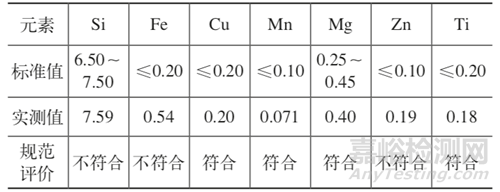 從該鋁合金大臂斷裂件上截取樣品,采用AR L8860火花放電直讀光譜儀進(jìn)行化學(xué)分析,結(jié)果見(jiàn)表1。從表1可看出,Si、Fe、Zn元素含量均偏 高,不符合規(guī)范要求。