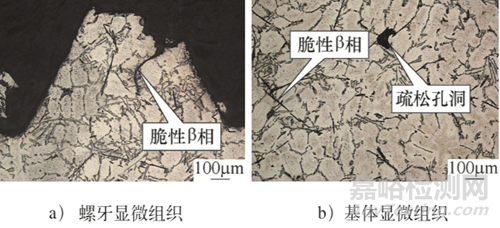 失效件樣品經(jīng)過(guò)混合酸腐蝕劑浸蝕,針狀β 相(Al9Fe2Si2)色澤明顯加深,粗大(α+Si) 共晶相仍呈淺灰色,樣品浸蝕后螺紋孔及基體組 織如圖3所示。由圖3a可看出,螺牙頂部沿黑色β相(Al9Fe2Si2)產(chǎn)生開(kāi)裂并造成齒頂剝落。由圖3a可看出,粗大(α+Si)共晶相及脆性β (Al9Fe2Si2)相,割斷了基體的連續(xù)性,顯著降低材料強(qiáng)韌性[3](見(jiàn)圖3a、b)。