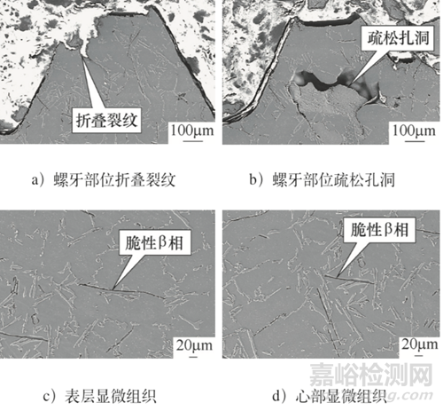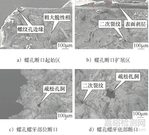 采用SIGMA 300掃描電子顯微鏡進(jìn)行檢測(cè),大臂斷裂的起始部位剛好位于強(qiáng)度最薄弱的螺紋孔部 位。表面剝層斷口人字紋收斂處指向螺紋孔邊緣, 推斷螺紋孔邊緣屬于斷口起始部位[4]。螺紋孔邊緣存在較多疏松及孔洞,使得薄壁的螺紋孔強(qiáng)度進(jìn)一 步降低。斷口顯示粗大沿晶及二次裂紋,并存在粗大脆性相[5](見(jiàn)圖4a、b)。螺紋孔的螺牙頂部已斷裂,螺牙底部仍存在較多疏松及孔洞,斷口顯示粗大沿晶及二次裂紋(見(jiàn)圖4c、d)。
