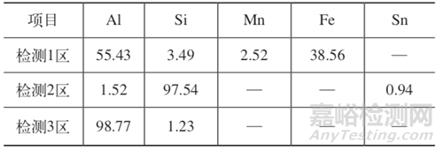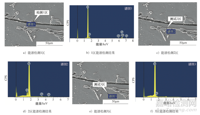 采用INCA X-MAX 20能譜儀,對(duì)失效件樣品 的基體組織進(jìn)行能譜分析。檢測(cè)1區(qū)為針狀黑色相 (見(jiàn)圖6a),針狀黑色相含有大量的Al、Fe、Si等 元素,推斷為β(Al9Fe2Si2)相(見(jiàn)圖6b)。檢 測(cè)2區(qū)為灰色相(見(jiàn)圖6c),灰色相中Si元素含量近 98%,推斷為(α+S i)共晶相(見(jiàn)圖6d)。檢測(cè) 3區(qū)為基體相(見(jiàn)圖6e),基體相中Al元素含量近 99%,推斷為α(Al)固溶相(見(jiàn)圖6f)。