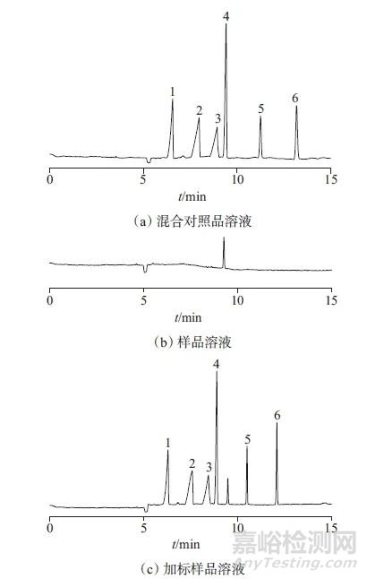 在1.2電泳條件下,分別取混合對照品溶液、健兒消食口服液樣品溶液、加標(biāo)樣品溶液(健兒消食口服液樣品)依次進(jìn)樣分析,電泳圖如圖1所示。結(jié)果顯示,6種著色劑的分離度均大于2.0,表明該方法專屬性符合要求。