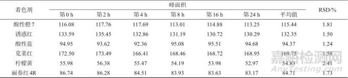 別在配制完成后第0、2、4、8、16、24 h時進(jìn)樣測定,計算各目標(biāo)物電泳峰面積,結(jié)果見表3。由表3可知,6種著色劑峰面積測定結(jié)果的相對標(biāo)準(zhǔn)偏差均不大于2.41%,表明在24 h內(nèi)樣品溶液穩(wěn)定性良好。