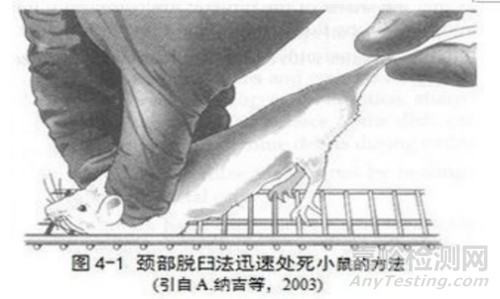(2)用右手抓住鼠尾根部并將其提起,放在鼠籠蓋或其他粗糙面上。用左手固定枕寰關(guān)節(jié)。