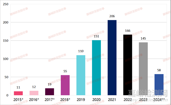 *數(shù)據(jù)包括根據(jù)前身快速訪問(wèn)途徑 (EAP) 指定的設(shè)備。由于前身 EAP 計(jì)劃和突破性器械計(jì)劃之間的愿景和指定標(biāo)準(zhǔn)是一致的,F(xiàn)DA 認(rèn)為根據(jù) EAP 授予指定的器械是突破性器械計(jì)劃的一部分。**表示2024年的數(shù)據(jù)是從2023年10月1日到2023年12月31日。